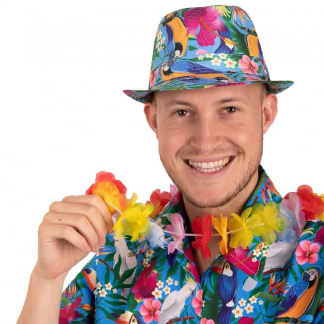 Maak jouw festival look helemaal af met dit kleurrijke fedora feesthoedje met Hawaii print!