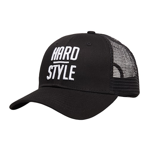 Festival cap with embroidered print: Hardstyle – Finely finished in black – Curved trucker model – Mesh back – Adjustable closure