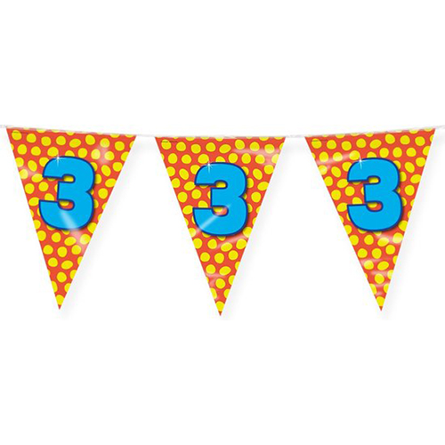 De derde verjaardag van jouw kindje is een belangrijke mijlpaal die je nooit meer wilt vergeten. Met deze kleurrijke vlaggenlijn voeg jij een vleugje feestvreugde toe aan deze speciale dag. De vlaggenlijn is gemaakt van hoogwaardig folie materiaal en is 10 meter lang. Je kunt de lijn gemakkelijk ophangen door de uiteindes ergens aan vast te knopen. Zo kun je de vlaggetjes ophangen aan bijvoorbeeld muren, plafonds, tafels of overal waar je maar wilt. Zo maak je de ruimte nog feestelijker. Deze kleurrijke vlaggenlijn bezorgt je kindje een geweldige 3e verjaardag. Hiep hiep hoera!