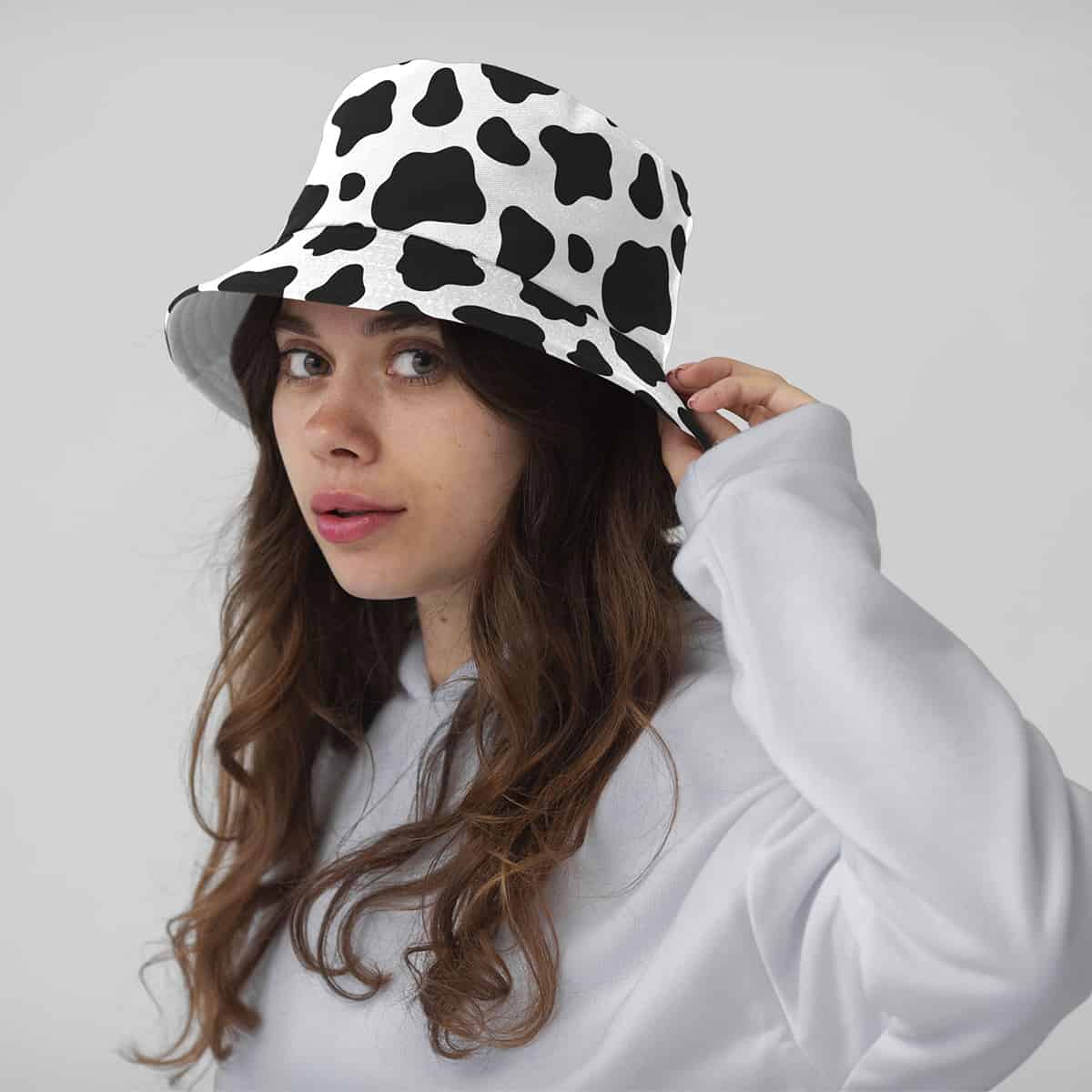 Maak jouw festival look helemaal af met deze leuke reversible bucket hat met vrolijke koeienprint van Yucka!